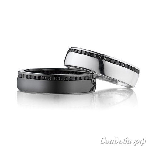 Парные обручальные кольца из белого матового золота и бриллиантов. Мужской вариант кольца сделан из белого золота с покрытием черным родием. По верхней части украшений проходит дорожка из черных бриллиантов. Женский вариант сделан из матового золота белого цвета. Верхняя часть украшения также украшена дорожкой из бриллиантов.