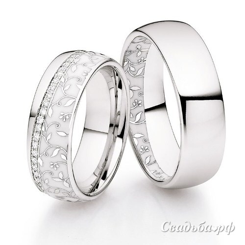 Парные обручальные кольца из белого золота с цветочным узором. Центр женского кольца декорирован полосой из эмали белого цвета с узором растительной тематики и дорожкой из бриллиантов по всей окружности. Мужской вариант обручального кольца с внешней стороны не имеет декоративных элементов. Полоса с эмалью и рисунком располагается с внутренней стороны украшения.