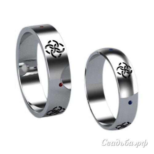 Парные обручальные кольца из белого золота. Украшения выполнены из белого золота с чередованием матовой и глянцевой поверхностей, на которые нанесен знак-оберег «Свадебник», символизирующий слияние двух родов. Женский вариант кольца более выпуклой формы и инкрустирован сапфирами, мужской – рубинами. По желанию молодоженов цвет золота может быть изменен.
