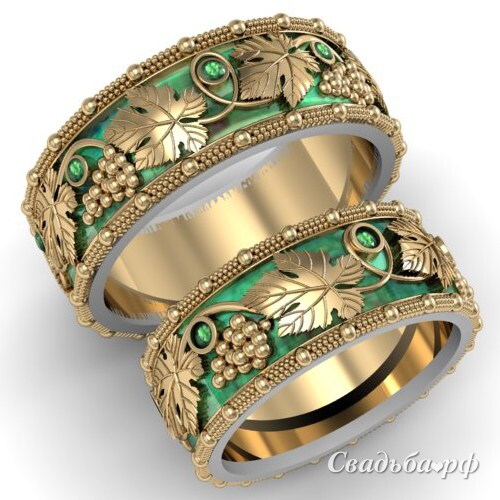 Красивые обручальные кольца с очень необычным дизайном. Украшения созданы из красного золота с использованием глянцевой эмали изумрудного цвета. По краям украшений проходит оригинальная окантовка, а в середине - объемный рисунок в виде виноградной лозы, одного из главных символов плодородия и изобилия.