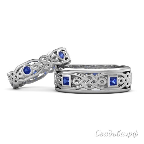 Фигурные парные обручальные кольца, в основу которых легли кельтские орнаменты. По всей окружности кольца украшают вставки из сапфиров: 5 круглых сапфиров на женском варианте и 5 квадратных на мужском. Цена указана за женское кольцо весом в 5,5 грамма.