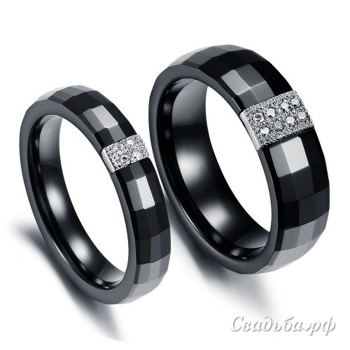 Необычные стильные обручальные кольца из белого золота с покрытием из черного родия. Кольца гладкие, но с прямоугольными гранями. В центре ювелирные изделия декорированы круглыми бриллиантами: 4 бриллианта на женском кольце и 8 на мужском. При этом камни расположены на вставке из белого золота с алмазной крошкой. Отличный выбор для любителей черного цвета.