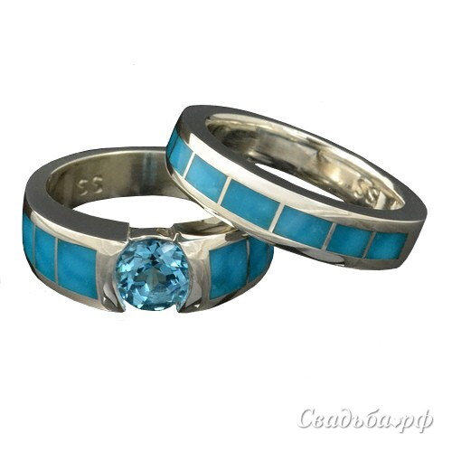 Данную модель парных обручальных колец выберут те молодожены, кому нравятся натуральные природные камни. Женский и мужской вариант колец выполнены из белого золота и по всему периметру украшены вставками из бирюзы. Женский вариант в центре инкрустирован крупным топазом.