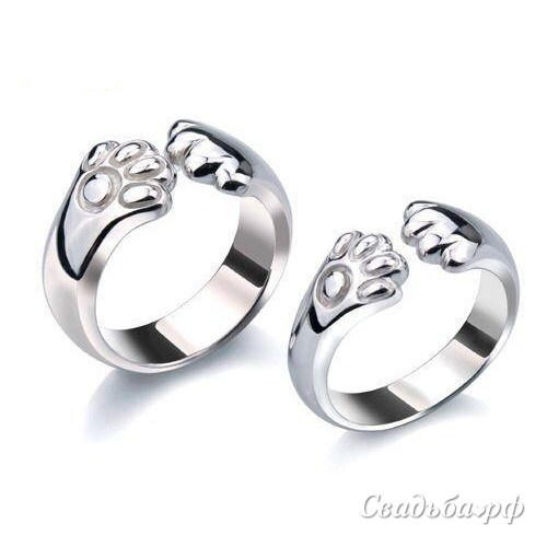 Эти обручальные кольца по достоинству оценят любители животных. Украшения обладают оригинальным дизайном и формой. Они выполнены из белого золота и представляют собой кошачьи лапки, которые обнимают безымянный палец своих обладателей.