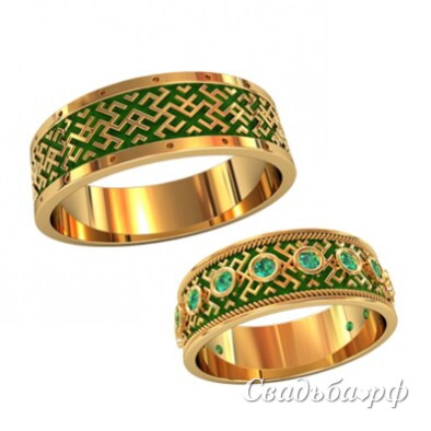 Парные обручальные кольца из красного золота и зеленой глянцевой эмалью. Мужское кольца по всему периметру имеет объемный орнамент в виде славянского оберега одолень-трава. По верхней и нижней части украшения проходят две глянцевые полосы. В женском варианте кольца эти полосы имеют рельефную фактуру, а по периметру украшение инкрустировано изумрудами.