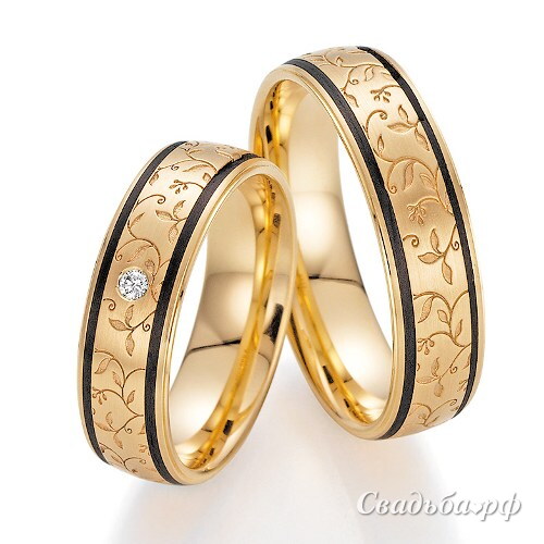 Невероятно красивые парные обручальные кольца. Эти украшения отличаются красотой и нежным дизайном. Оба кольца изготовлены из красного золота и по всему периметру декорированы цветочным орнаментом. По нижней и верхней части украшений проходят две полосы контрастного черного цвета, что придает им особенный шарм. Женский вариант кольца в центре инкрустирован бриллиантом.