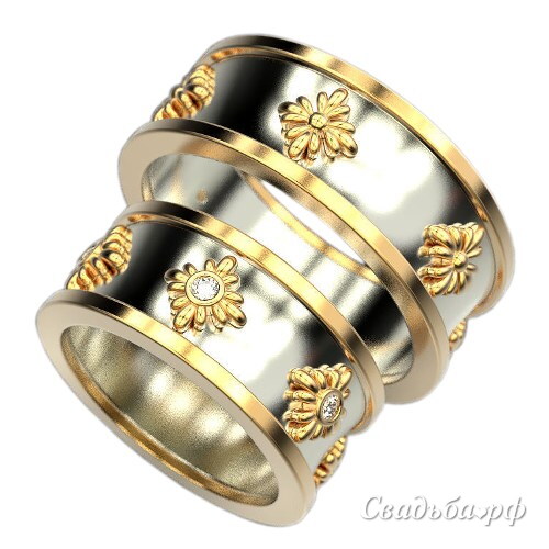 Необычные обручальные кольца с ярким дизайном. Парные украшения выполнены из комбинированного золота. Основная часть кольца сделана из золота белого цвета, а элементы декора - из желтого золота. По верхней и нижней части кольца украшены полосами желтого света. А по всему периметру изделия декорированы цветами. В женском варианте сердцевина цветов инкрустирована бриллиантами.