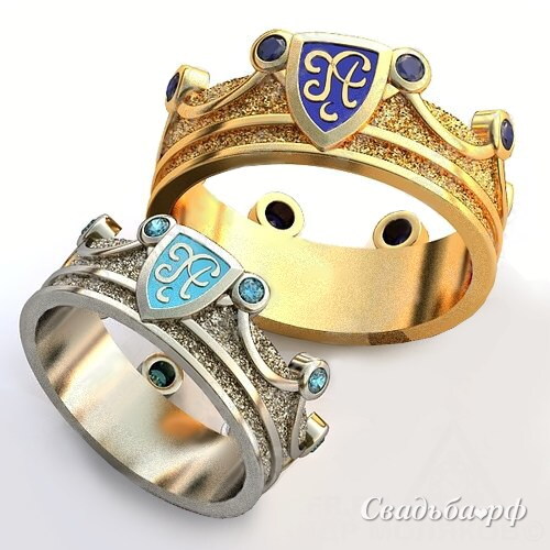 Это не просто оригинальные обручальные кольца в виде корон, это настоящее произведение искусства. На передней части ювелирных украшений расположен уникальный символ – герб семьи. Этот необычный декоративный элемент сделает кольца уникальными. По желанию молодоженов данные кольца могут быть выполнены из золота любого цвета.