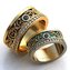 Красивые парные обручальные кольца, выполненные в оригинальном дизайне. В этих ювелирных изделиях идеально соединились роскошь и изящество. На поверхности цветной эмали расположился витиеватый рокайлевый узор, выполненный техникой филигрань. Узор обрамляют золотые ободки, один из которых гладкий, а другой полностью инкрустирован дорожкой из круглых бриллиантов. По центру всего украшения красуется один большой черный бриллиант. Мужское и женское кольцо в этой паре могут быть совершенно одинаковыми, а могут отличаться цветом золота и цветом эмали. В представленном варианте мужское кольцо из желтого золота с темно-красной эмалью, а женское из золота белого цвета с эмалью цвета изумруда.