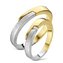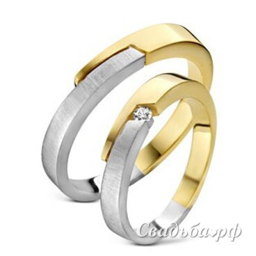 Современные парные обручальные кольца, одна половинка которых выполнена из белого золота, а вторая из желтого. Женский вариант в центре инкрустирован круглым бриллиантом.
