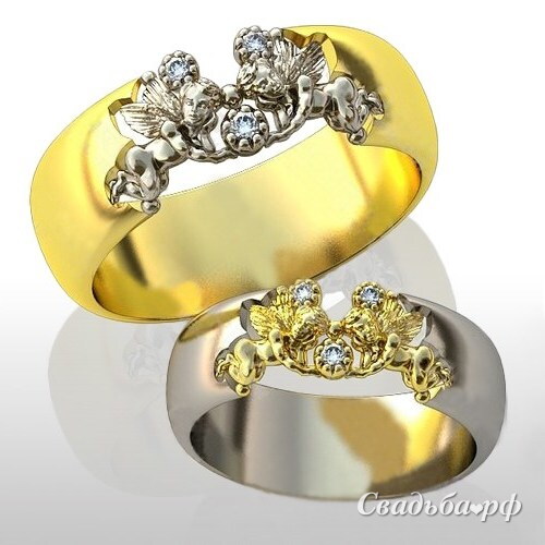 Необычный дизайн этих парных обручальных колец мгновенно бросается в глаза. В центре украшения пара купидончиков с держит бриллиантовое облачко, и ещё по одному "облаку" над крылом у каждого. Купидоны сделаны из контрастного золота, если женское кольцо из белого золота, то фигурные ангелы из желтого, в мужском - наоборот.