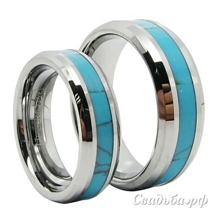 Эти обручальные кольца отличаются своим необычным оформлением. Украшения выполнены из золота белого цвета, а в середине по всему периметру декорированы полосой из натурального камня - из бирюзы. Эти украшения идеально подойдут тем молодоженам, кто хочет быть в центре внимания.