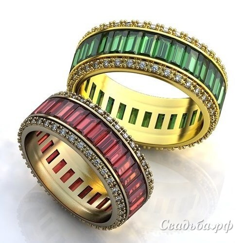 Парные обручальные кольца из желтого золота. По всему периметру кольца инкрустированы драгоценными камнями. Мужской вариант кольца декорирован изумрудами, а женский - рубинами. Верхнюю и нижнюю часть ювелирных изделий украшает дорожка из мерцающих фианитов.