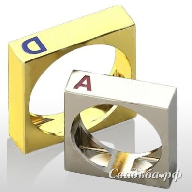 Эти парные обручальные кольца созданы для тех пар, которые хотят продемонстрировать свою индивидуальность. Данные ювелирные изделия имеют оригинальную форму, они выполнены в виде квадрата. О том, насколько комфортно будет влюбленным в таких кольцах судить сложно, но то, что молодожены смогут выделиться – это неоспоримый факт. По желанию, кольца могут быть выполнены из золота различных цветов, возможно нанесение гравировки.