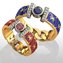 Необычные обручальные кольца с ярким неповторимым дизайном. Украшения выполнены из комбинированного золота. Уникальная особенность этих изделий – эмаль, которая использована в их декоре. Женское обручальное кольцо покрыто эмалью красного цвета, а мужское - синего. В центре кольцо украшено круглым рубином в цвет эмали, с двух сторон от которого дорожки из 5 бриллиантов.