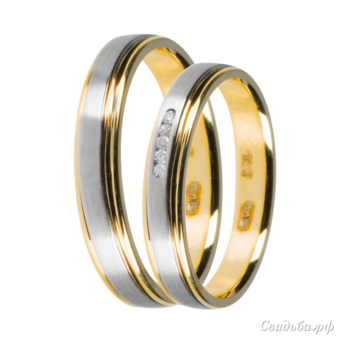 Парные обручальные кольца – это выбор стильных и романтичных молодожёнов. Представленные колечки выполнены лучшими итальянскими ювелирами из жёлтого золота. Широкие продольные вставки из белого драгоценного металла придают изделиям особый шик, ведь комбинированные украшения – это писк сезона! Женская модель дополнена сверкающими бриллиантами.