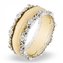 Нестандартное обручальное кольцо станет ярким штрихом любого вашего образа. Классический ободок из жёлтого золота может похвастаться матовой поверхностью и рельефным узором по краям, выполненным из белого драгоценного металла. Чистейшие бриллианты расположились по периметру колечка. Стиль и элегантность в одном флаконе!