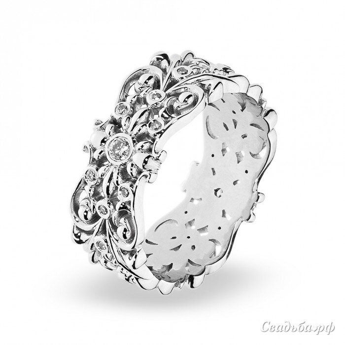 Нестандартное обручальное кольцо отечественного производства понравится ценителям изысканности и стиля. Изящный ободок из белого золота украшен тонким орнаментом и чистейшими бриллиантами в искусной оправе. Изделие комфортно сидит на пальчике. Такое колечко от ведущих ювелиров будет напоминать Вам о дне рождения Вашей семьи всю жизнь.