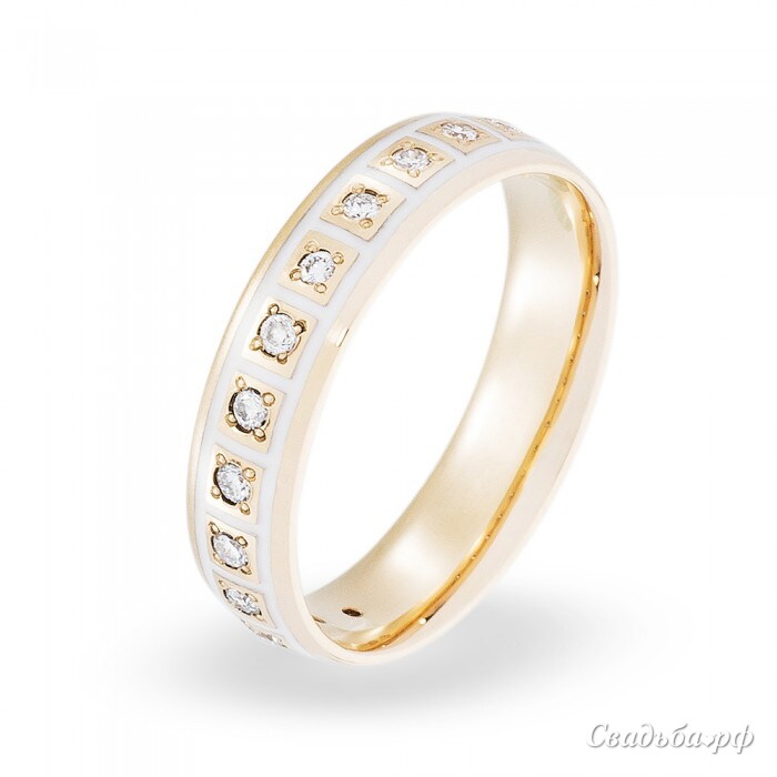 Комбинированное обручальное кольцо выполнено в греческом стиле: традиционный орнамент украшен чистейшими бриллиантами. Изящный ободок из жёлтого золота и дополнен светлыми вставками. Это ювелирное украшение отечественного производства станет эффектным штрихом Вашего сногсшибательного образа. Кольцо отлично сочетается с другими аксессуарами.