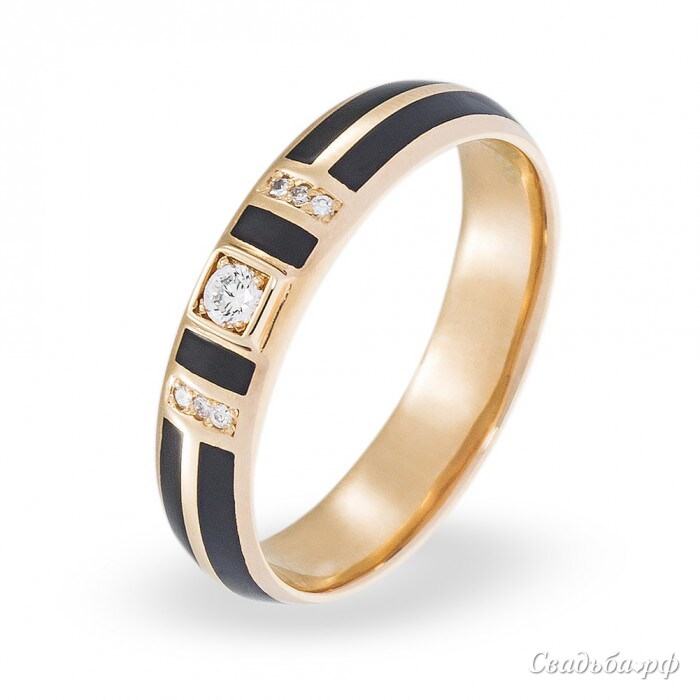 Представленное обручальное колечко от ведущих ювелиров России гармонично сочетает в себе классику и модерн. Ободок классической формы выполнен из жёлтого золота высочайшей пробы. Чёрные вставки и сверкающие бриллианты придают украшению нестандартность и особый шик. Чистейшие камни в искусной оправе буквально ослепляют своим блеском.