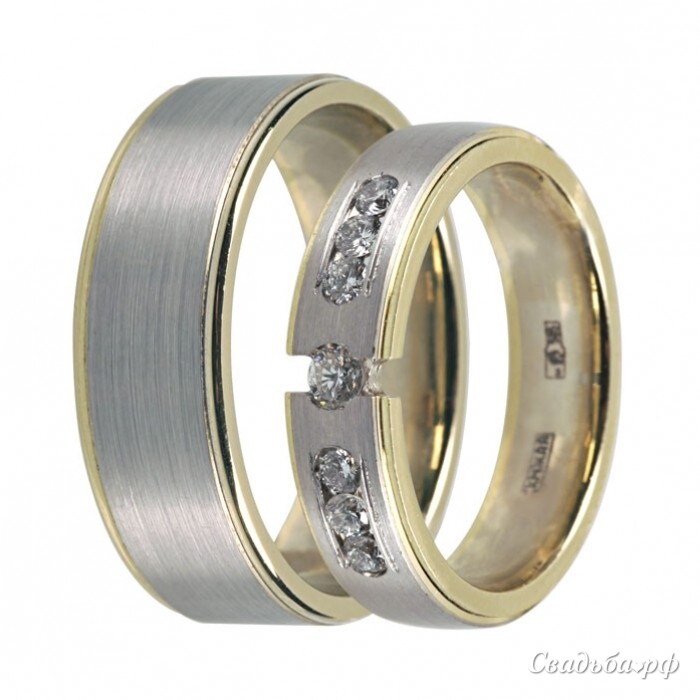 Восхитительные обручальные кольца для Него и для Неё выполнены лучшими итальянскими ювелирами из нескольких видов драгоценного металла. Золотистая основа гармонично сочетается с матовыми вставками из белого золота. Женское колечко дополнено крупным бриллиантом и несколькими камнями меньшего размера по обе стороны от основного бриллианта.