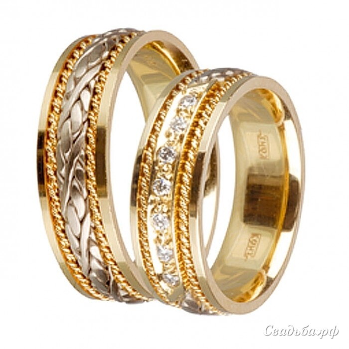 Потрясающие обручальные кольца для Него и дня Неё отличаются оригинальным дизайном и тончайшим исполнением. Широкие ободки из нескольких видов драгоценного металла украшены переплетёнными золотыми нитями. Женская модель дополнена сверкающими бриллиантами. Кольца смотрятся необычно и свежо – как раз то, что нужно современным молодожёнам.
