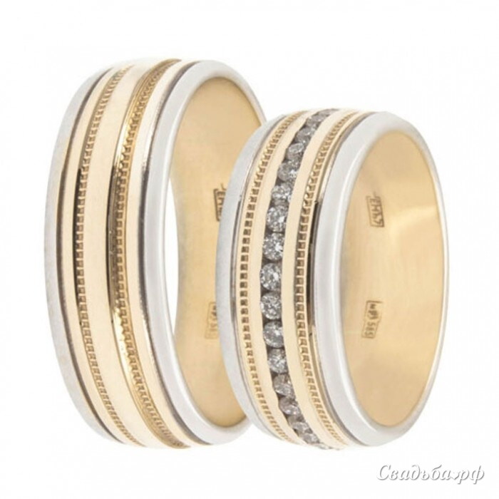 Массивные обручальные кольца для жениха и невесты выполнены из белого драгоценного металла и дополнены золотистой продольной вставкой с рельефным узором. Женское колечко украшено дорожной чистейших бриллиантов безупречной огранки. Представленные изделия от лучших итальянских ювелиров придутся по душе самым стильным молодожёнам.