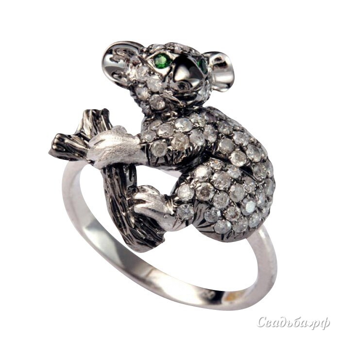 Обручальное кольцо, изготовленное из золота двух оттенков, с интересным нестандартным художественным решением. Гладкий ободок кольца увенчан крупной фигуркой смешного зверька, сидящего на ветке, полностью выложенной бриллиантами. Такое решение в выборе обручального кольца, наверняка не оставит никого равнодушным и позволит подчеркнуть Вашу индивидуальность