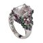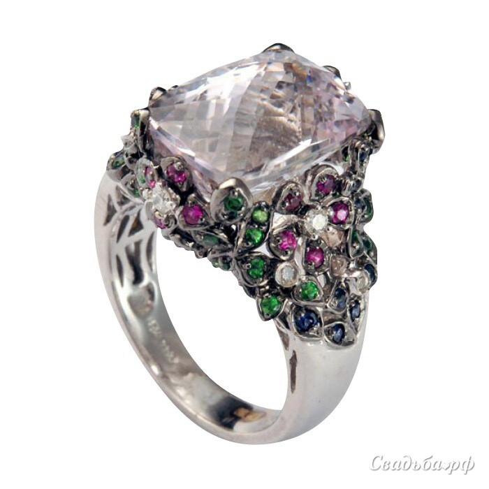 Роскошное обручальное кольцо, изготовленное из белого золота. Кольцо напоминает собой шикарный королевский перстень, усыпанный драгоценными камнями разного размера и цвета, в виде замысловатого цветочного узора. Искрящийся блеск, исходящий от кольца привлекает к себе восторженные взгляды и подчеркивает неординарный вкус и красоту своей обладательницы