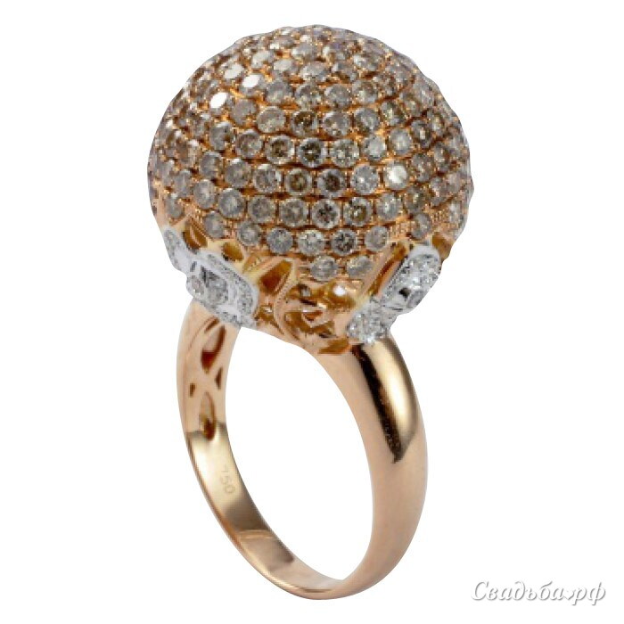 Крупное и представительное кольцо из желтого золота 750 пробы. Ювелирное изделие украшено шаром из золота, усыпанным множеством бриллиантов. Актуальный дизайн и удобство носки делают это кольцо необычайно привлекательным. Уникальное предложение для покупателей: сейчас это кольцо можно приобрести за 95 040 руб., в то время как старая цена составляла 190 080 руб.!