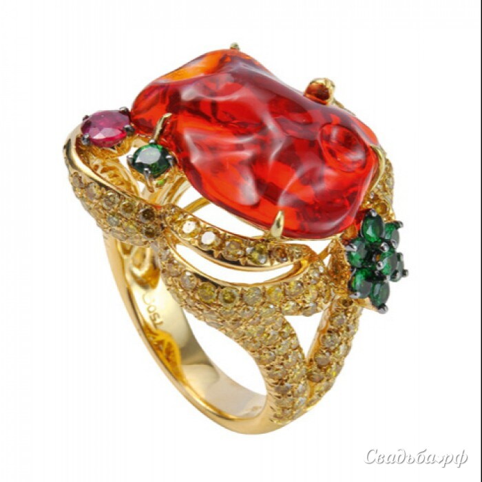 Невероятное обручальное кольцо, способное поразить внимание всех окружающих. Выполнено из желтого золота. Украшено множеством бриллиантов по всей поверхности изделия, опалом, рубином и гранатом. Превосходный итальянский дизайн. внутренняя часть выпуклая, за счет чего ношение доставит вам только удовольствие. Прежняя цена составляла 243 480 руб, новая - от 121 740 руб.