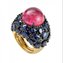 Потрясающее необычное обручальное кольцо из Италии. Для тех особ, которые привыкли ощущать свою уникальность и быть в центре внимания. Основу составляет желтое золото, украшено оно крупным светло-пурпурным камнем по центру и глубокими синими камнями вокруг. Внутренняя поверхность имеет выемки, созданные для комфортной носки изделия.