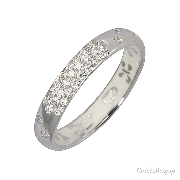 Korloff Wedding Collection. Роскошное обручальное кольцо из белого золота с бриллиантами. Центральная часть кольца украшена россыпью сверкающих камней. На боковых гранях симметрично расположены отдельные бриллианты. Фирменный королевский лак Korloff и знаменитый логотип французского ювелирного дома. Стоимость зависит от размера кольца.