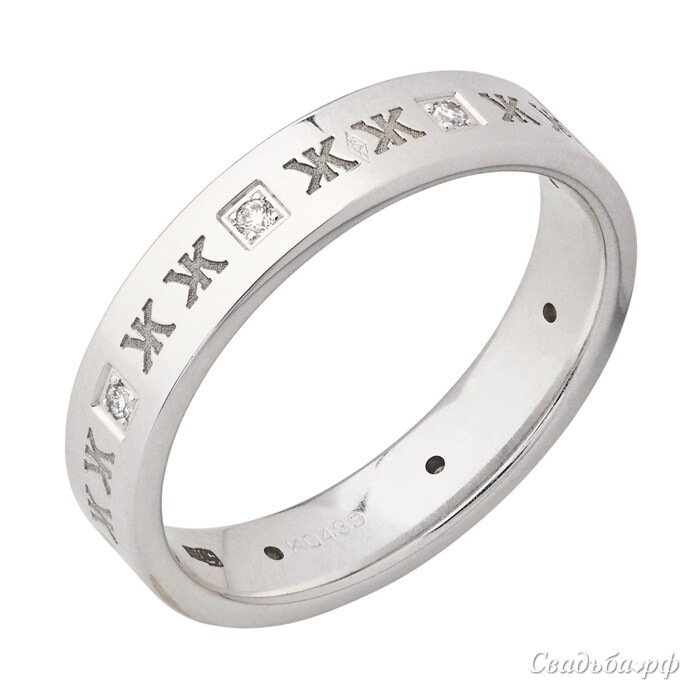 Потрясающее обручальное кольцо из белого золота с бриллиантами. По всей поверхности кольцо украшено знаменитыми логотипами французского ювелирного дома Korloff в виде парящей бабочки. Между логотипами в небольших квадратных ячейках эффектно расположены бриллианты. Их блеск покорит даже самых искушенных ценителей драгоценных украшений.