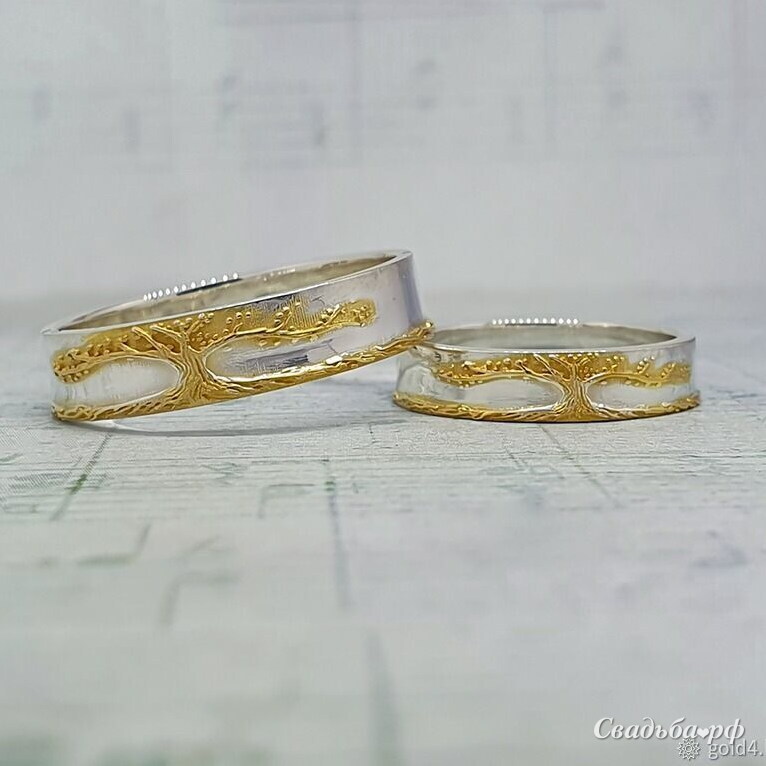 Свадебные кольца из серебра с позолотой, кольца с деревьями