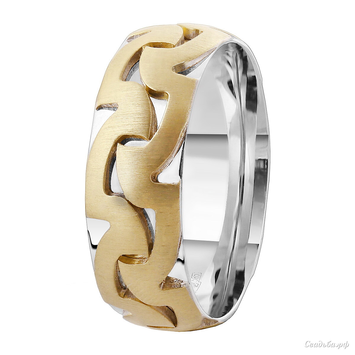 Обручальное кольцо выполнено из белого и желтого золота 585 пробы.