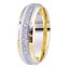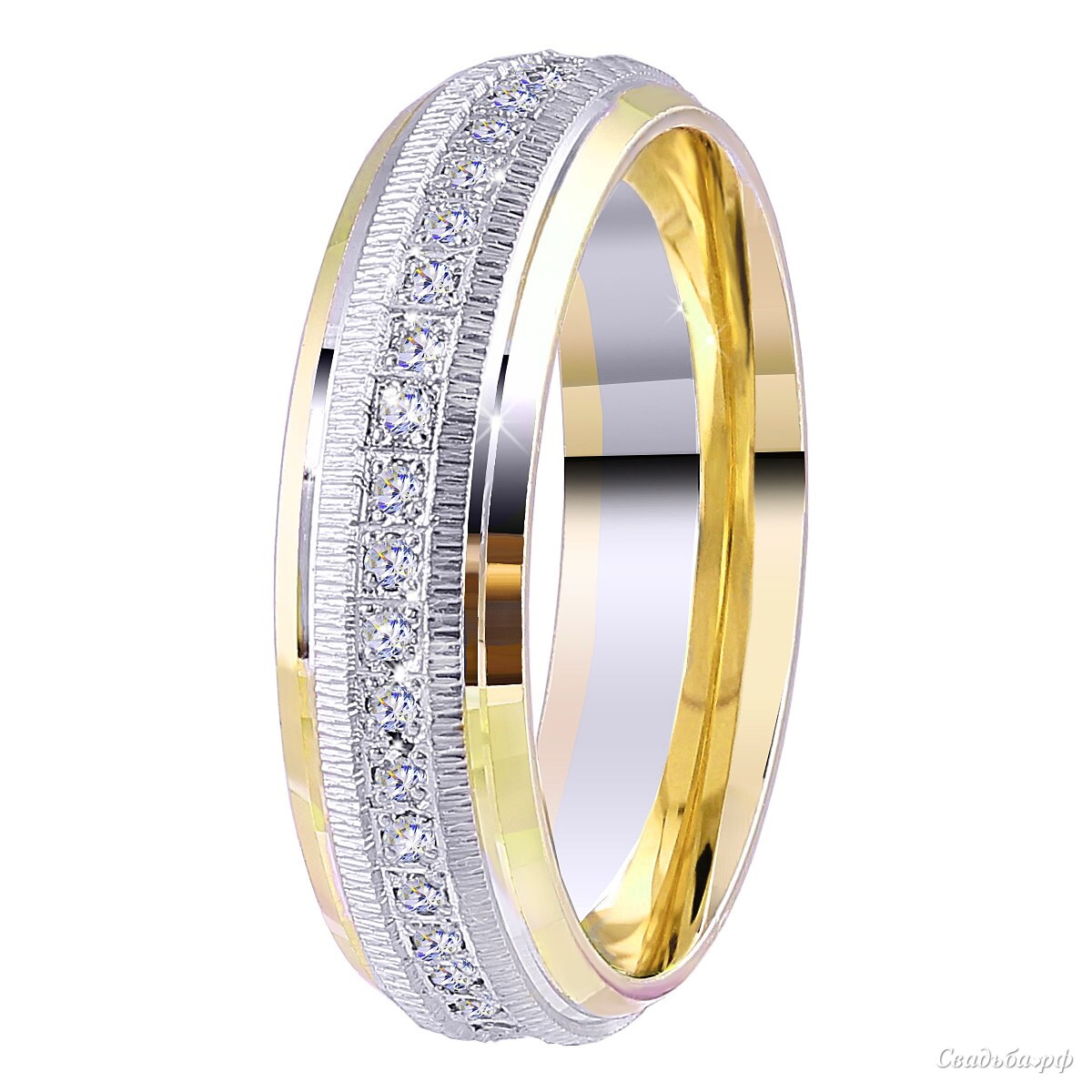Обручальное кольцо выполнено из комбинированного золота 585 пробы. Ширина кольца составляет 5мм. Невероятно красиво сочетаются между собой белое и желтое золота. Главным украшением кольца является его центральная часть, она выполнена из белого золота с нанесением алмазки. Края же, наоборот отполированные до блеска. Такие разные текстуры, вместе смотрятся невероятно красиво и современно. По всему периметру, проходит бриллиантовая дорожка, которая делает это кольцо роскошным. Каждая деталь этой модели доведена до совершенства. Примерив однажды такое обручальное кольцо, вы вряд ли захотите с ним расставаться.