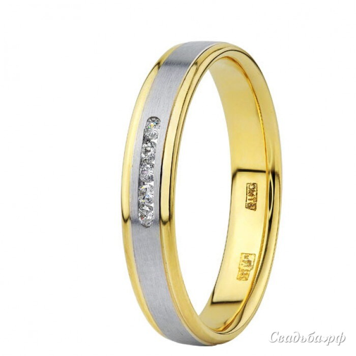 Изящное обручальное кольцо выполнено из нескольких видов драгоценного металла. Золотистая основа гармонично сочетается с широкой продольной полосой серебристого цвета. Сверкающие краешки и матовая серединка составляют отличный тандем. Это ювелирное изделие отечественного производства дополнено несколькими чистейшими бриллиантами.