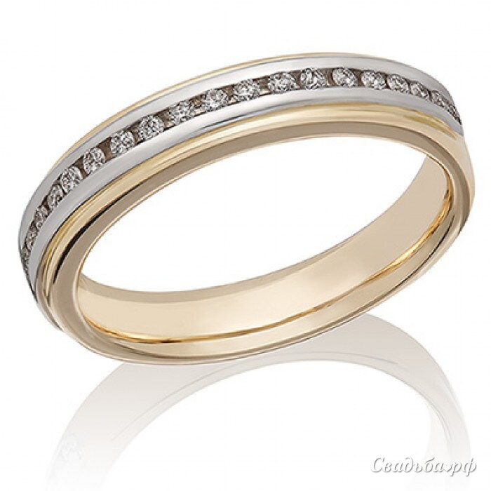 Потрясающее обручальное кольцо выполнено из двухх видов драгоценного металла. Золотистый ободок дополнен серебристой вставкой. Целая россыпь чистейших бриллиантов безупречной огранки придаёт этой модели особый шарм и торжественность. Представленное колечко отлично сочетается с другими украшениями.