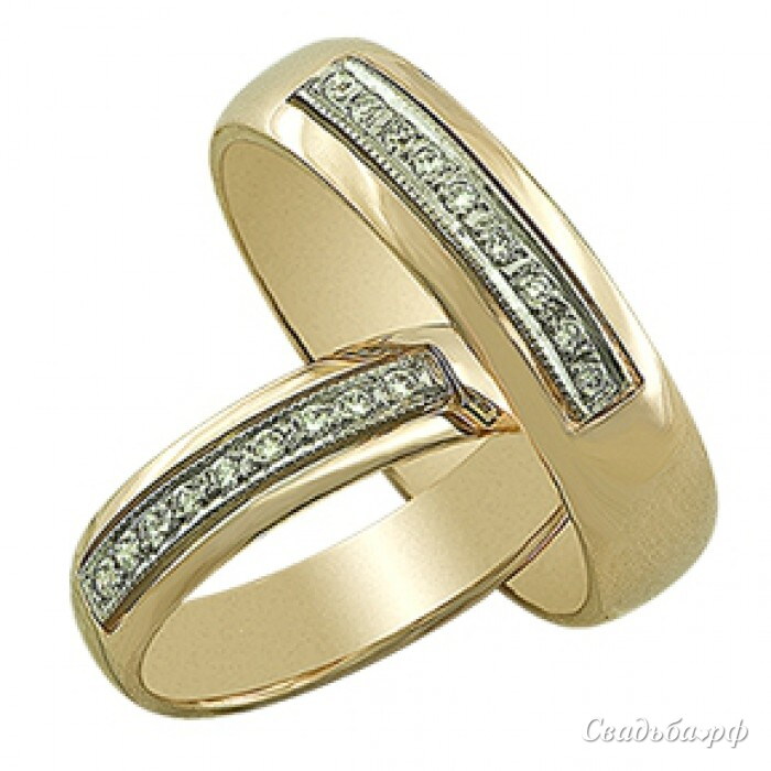 Массивное обручальное кольцо с контрастной вставкой придётся по вкусу самым притязательным молодожёнам. Широкий ободок дополнен девятью сверкающими бриллиантами безупречной огранки. Представленная модель может быть изготовлена из жёлтого, красного или белого золота. С таким украшением вы всегда будете неотразимы!