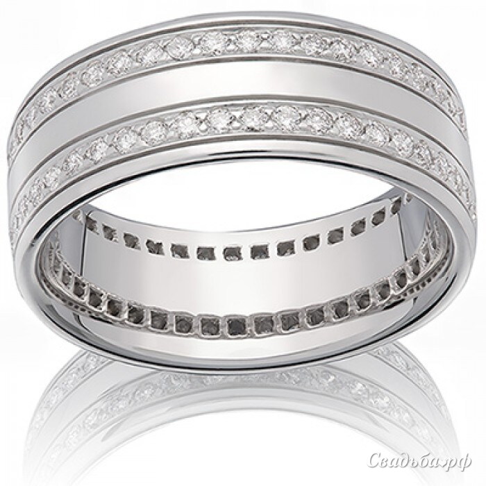 Поистине королевское колечко отечественного производства станет эффектным дополнением вашего неповторимого образа. Широкий ободок выполнен из белого золота высшей пробы. Модель дополнена двумя рядами сверкающих бриллиантов безупречной огранки. Такое обручальное кольцо удобно сидит на пальчике и гармонично сочетается с другими украшениями.