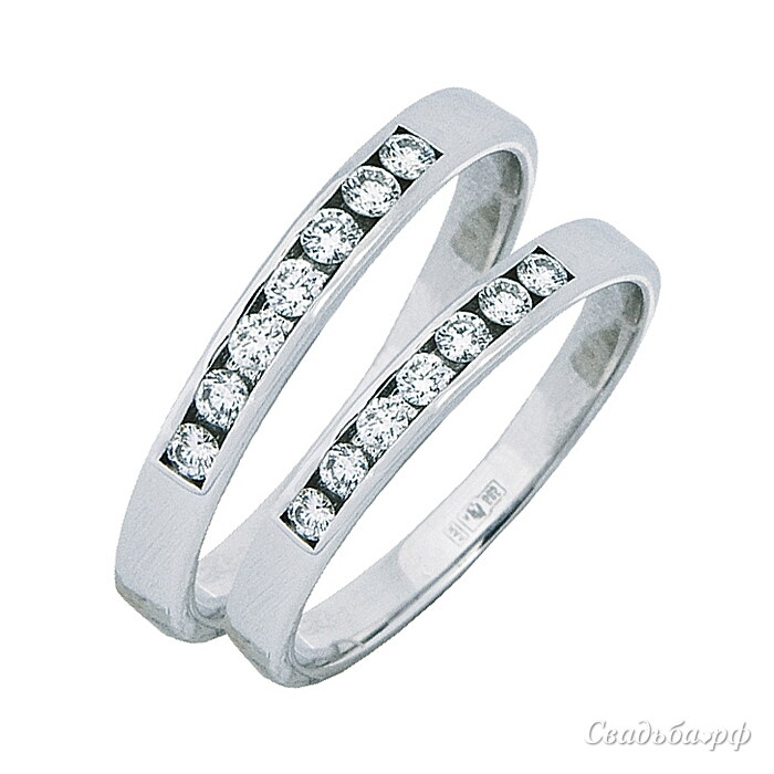 Изысканные парные обручальные кольца 585 пробы из белого золота с бриллиантами. Этот бесподобный комплект свадебных колец примечателен элегантным дизайном, изюминкой которого является расположенный по центру ряд из 7 переливающихся в невероятной игре света бриллиантов. Внутренний профиль изделий выполнен в форме comfort fit, что гарантирует удивительно комфортную посадку. Пара роскошных колец - идеальный вариант для ценителей стиля и изысканности.