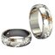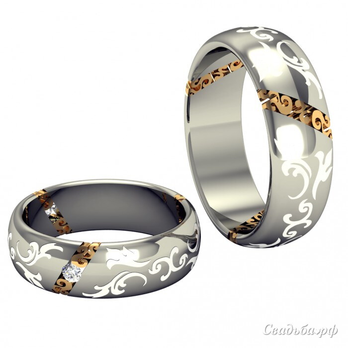 Изысканные парные обручальные кольца из белого и желтого золота с эмалью, женский вариант кольца инструктирован бриллиантами. Невероятно эффектные парные изделия из платины, украшает затейливая вязь и широкие косые полосы-вставки из сияющего желтого золота с нежным орнаментом. Сказочно красивые обручальные кольца!