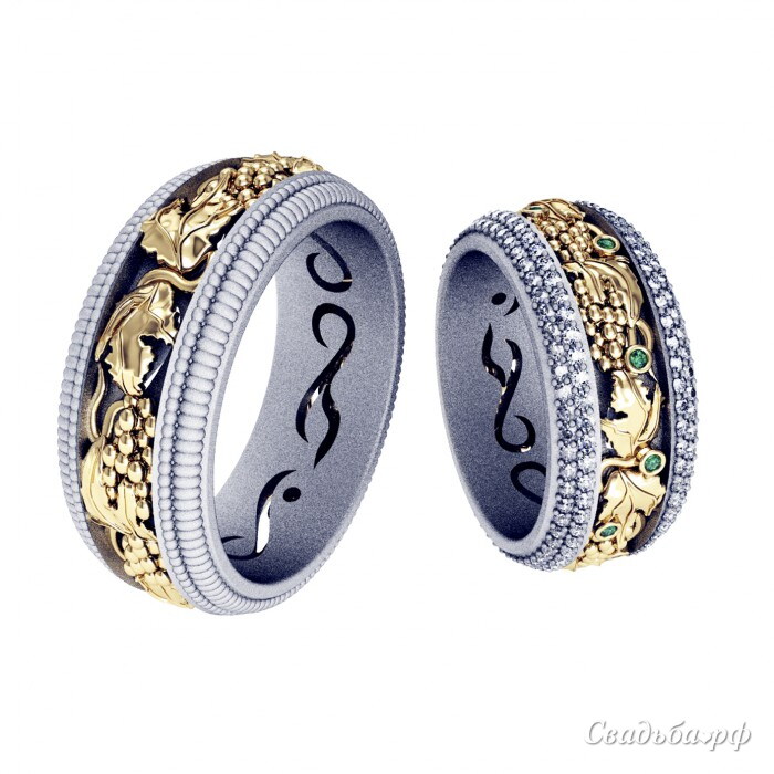 Роскошные парные обручальные кольца из белого и желтого золота, вариант для нее может быть выполнен с изумрудами. Платиновые изделия с оригинальной окантовкой, украшает изысканный рельефный декор из желтого золота в виде виноградной лозы, символизирующей счастье и достаток. Эти восхитительные парные кольца обязательно станут источником неиссякаемой радости и бесконечного счастья.