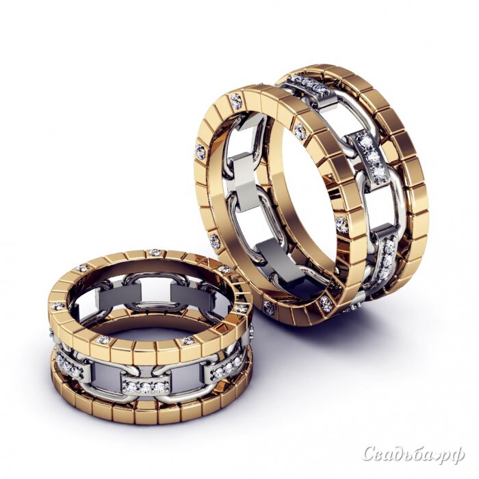 Парные обручальные кольца изготовлены из комбинированного золота двух оттенков и украшены бриллиантами. Модель выполнена в оригинальном дизайнерском ключе - в виде толстой золотой цепи белого цвета, заключенной в широкие резные ободки из желтого золота. Надевая такие обручальные кольца, Вы символично укрепляете свой союз.