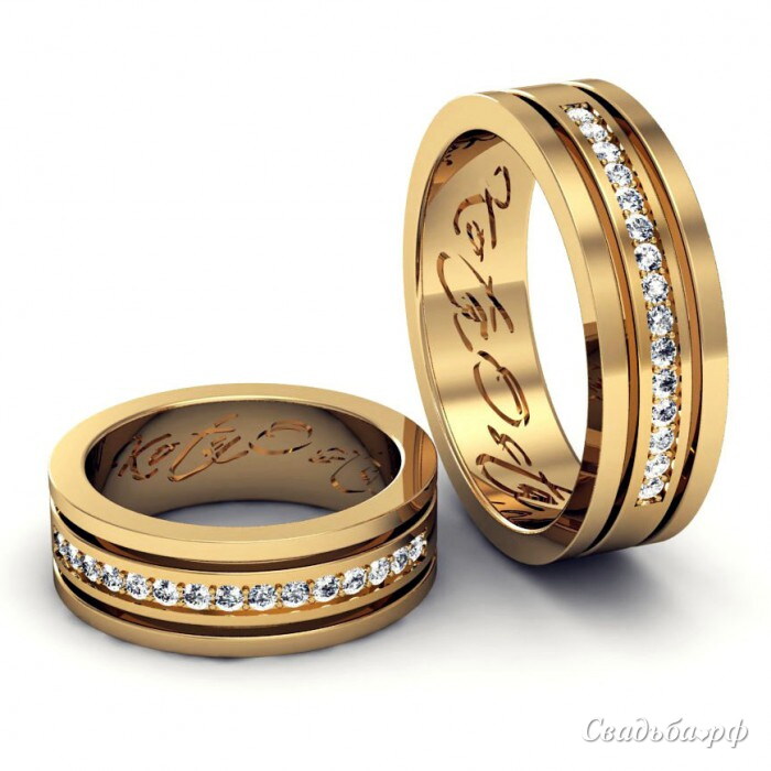 Парные обручальные кольца, изготовленные из золота желтого цвета. Кольца украшены двумя горизонтальными бороздами и дорожкой из бриллиантов круглой огранки. Стильный дизайн этих ювелирных украшений, бесспорно, украсит Ваши руки, а яркий блеск камней будет напоминать о счастливых мгновениях долгие годы.