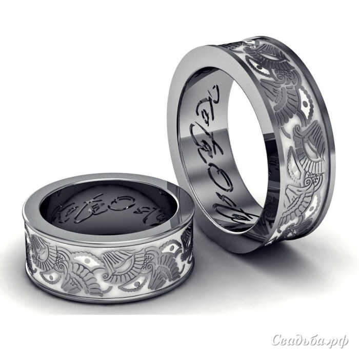 Оригинальные парные обручальные кольца с широкими ободками из высококачественного белого золота декорированы уникальным дизайнерским рисунком. Эта стильная модель отличается совершенными формами и высоким качеством исполнения. Вот увидите: с представленным ювелирным украшением всегда будете в центре всеобщего внимания.