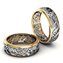 Парные обручальные кольца, изготовленные из комбинации золота двух оттенков, по оригинальному авторскому эскизу. Два тонких обода из золота желтого цвета удерживают между собой сложную плетеную композицию из белого золота. Женское кольцо украшают бриллианты, великолепной огранки, что придает украшению еще большее сияние.