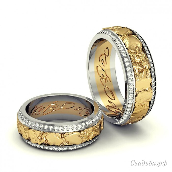 Парные обручальные кольца, оригинального авторского дизайна, изготовленные из комбинации золота двух оттенков. Между двух тонких ободков из белого золота, украшенных по всему диаметру бриллиантами, расположено кольцо из желтого золота, по своей структуре напоминающее необработанный драгоценный металл. Эти обручальные кольца всегда будут смотреться оригинально.