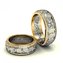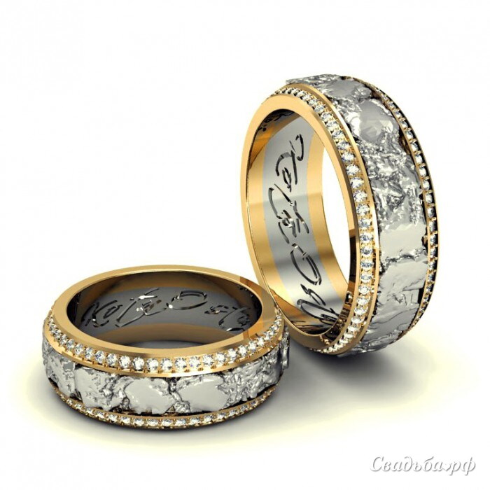 Парные обручальные кольца, изготовленные из комбинации золота двух цветов, отличаются своим оригинальным стилистическим решением. На первый взгляд можно подумать, что в центре поверхности колец находится золото белого цвета в совершенно необработанном виде Уникальное в своем роде кольцо украшено золотыми ободками с бриллиантами контрастного желтого цвета.